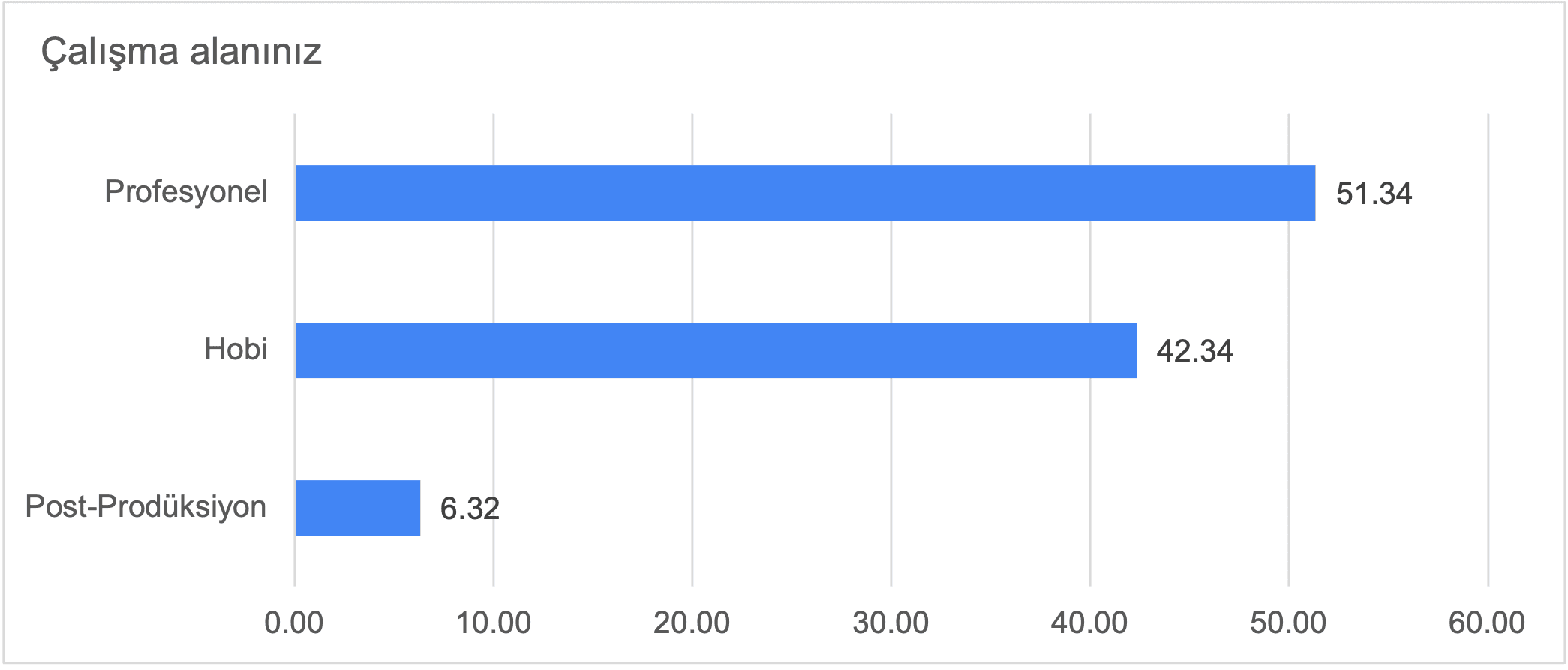 Katılımcıların %51.34’ü müzik prodüksiyonu ile profesyonel olarak, %42.34’ü müzik prodüksiyonu ile hobi olarak ilgilendiğini söylemiş. Katılımcıların %6.32’si ise post prodüksiyon (görüntülü medya için ses) alanında çalıştığını ifade etmiş.