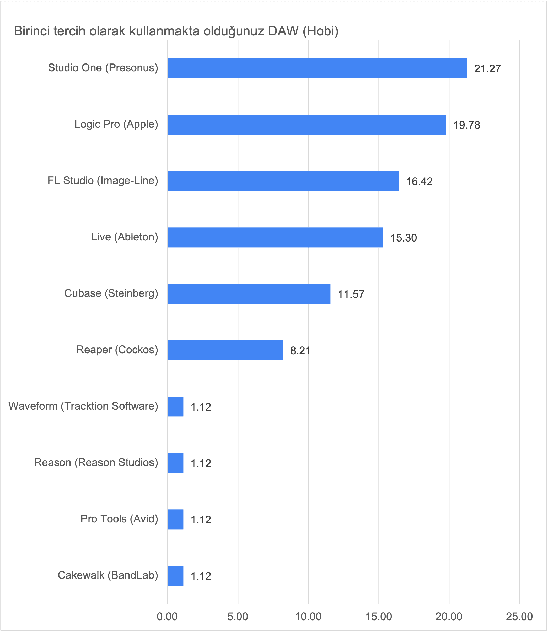2025 DAW anketinde müzik prodüksiyonu ile hobi olarak ilgilenenlerin tercihi STUDIO ONE (Presonus) oldu. İkinci sırada LOGIC PRO (Apple), üçüncü sırada ise FL STUDIO (Image-Line) var.