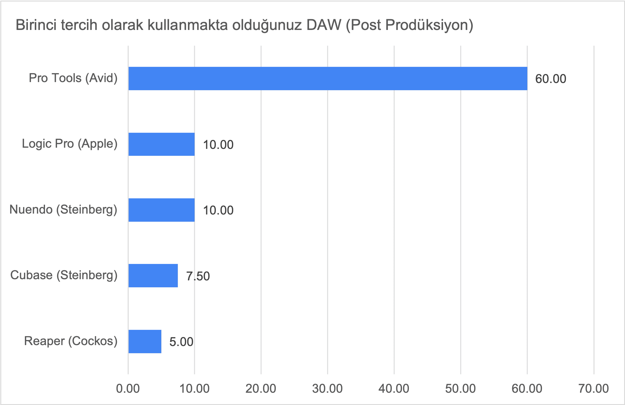 2025 anketinde post prodüksiyon üzerine çalışanların tercihi geçmiş senelerde de olduğu gibi açık ara ile PRO TOOLS (Avid) oldu (%60). Pro Tools özellikle ev kullanıcılarının artmasıyla müzik prodüksiyon alanında popülerliğini kaybetmeye devam etse de post prodüksiyon alanında liderliğini koruyor.