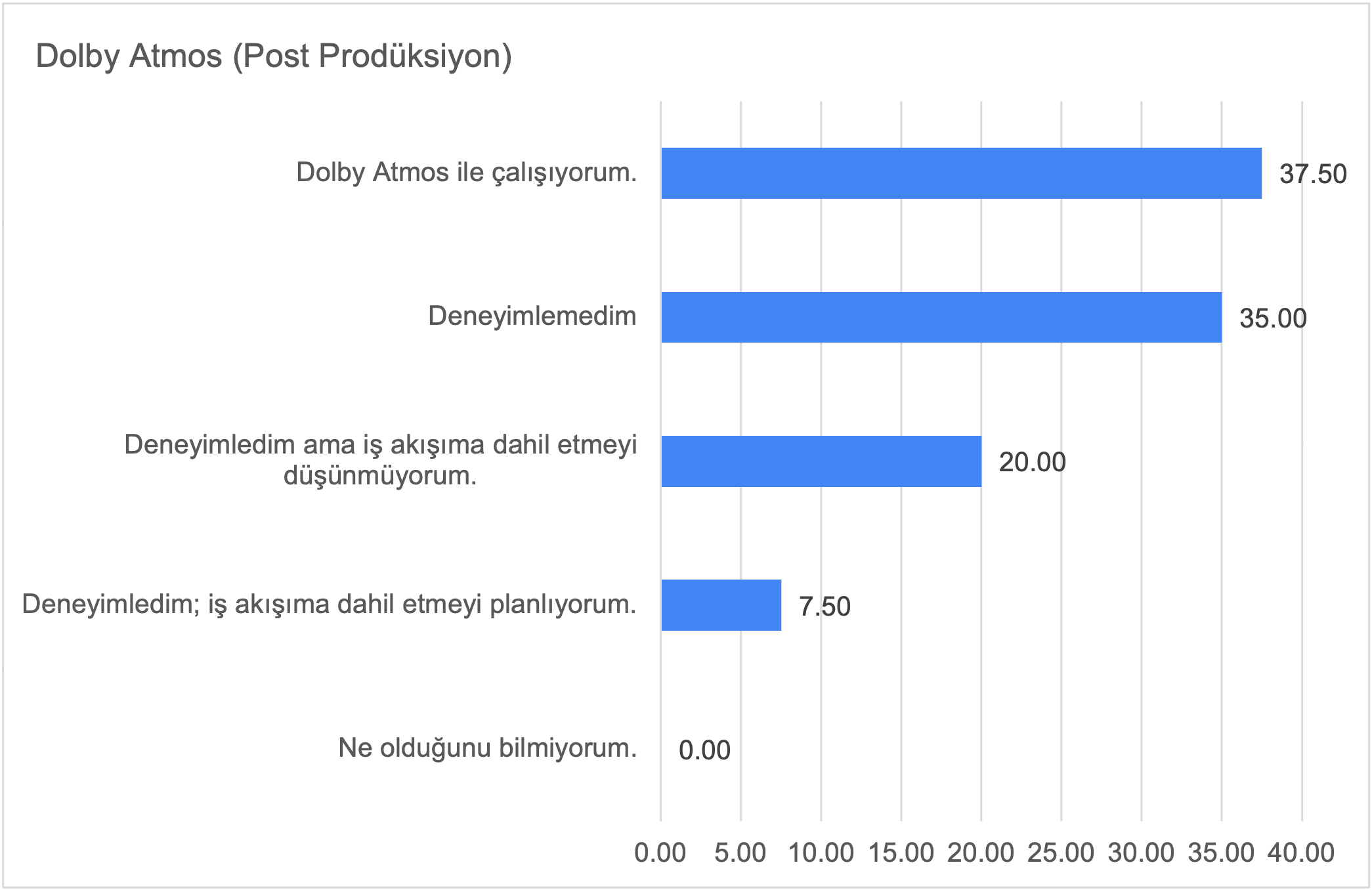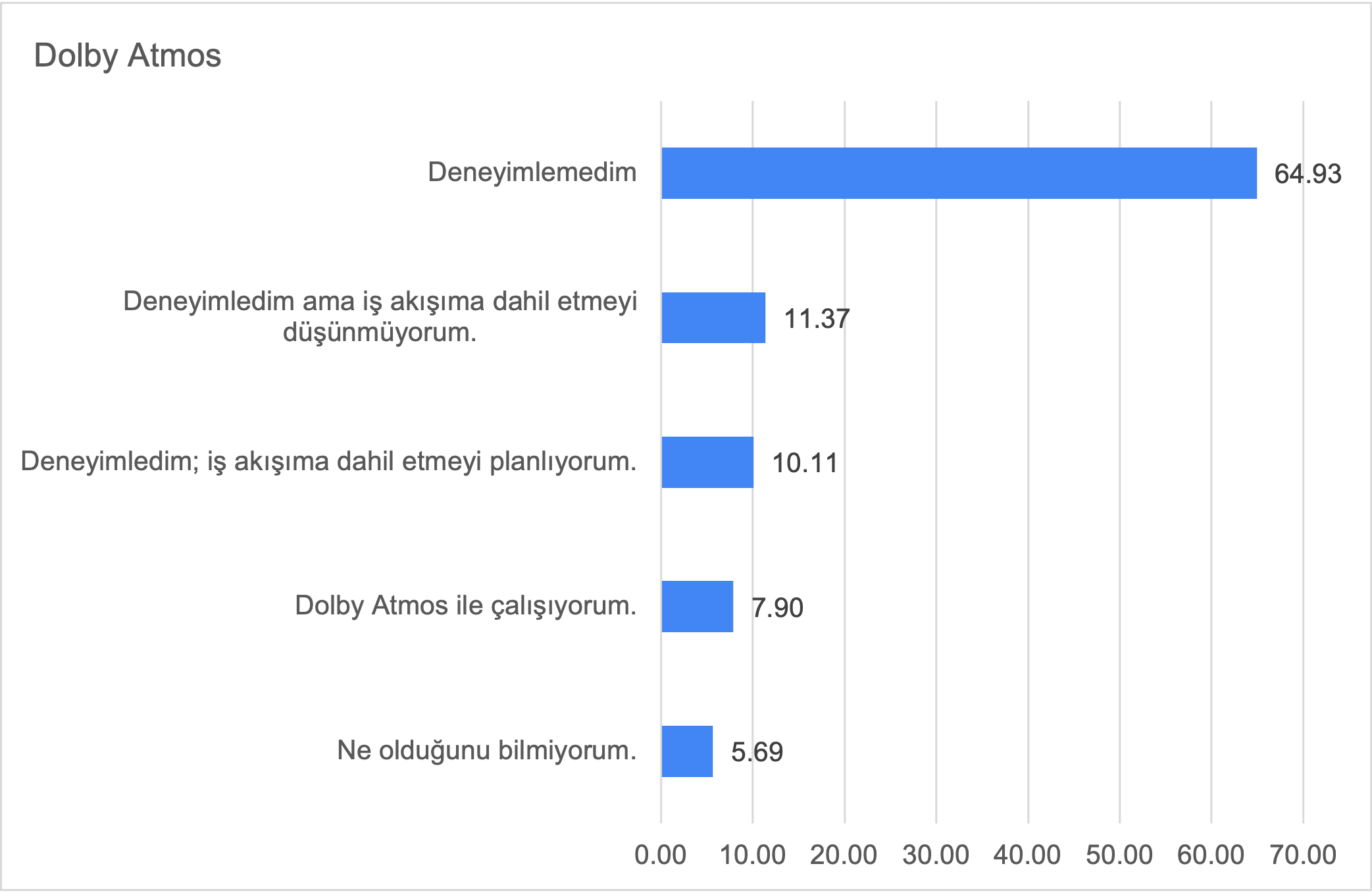 Post-prodüksiyon alanında Dolby Atmos ile çalışanlar yaklaşık %37’lik bir kesimi oluşturuyor. Bu alanda oy kullananlar arasında Dolby Atmos’un veya uzamsal sesin ne olduğunu bilmeyen yok.
