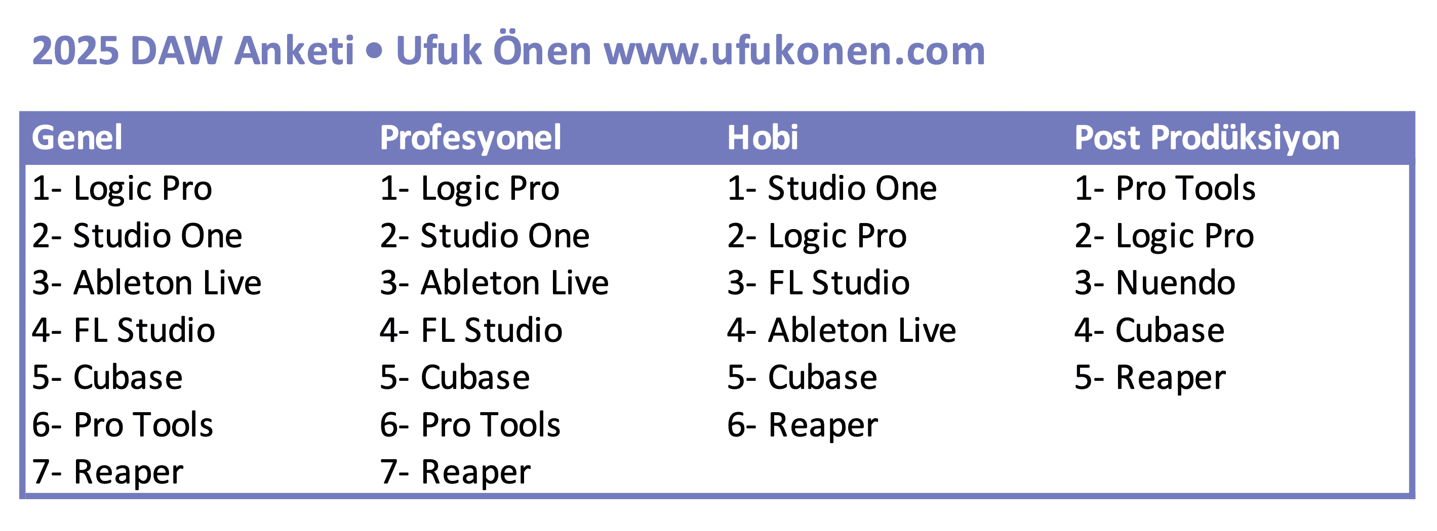 2025 DAW anketinin galibini açıklamadan önce hemen belirtmek isterim, DAW tercihleri profesyoneller, hobi olarak ilgilenenler ve post-prodüksiyon alanında çalışanlar arasında farklılıklar gösteriyor. Bunları aşağıda detaylı olarak inceleyeceğim.